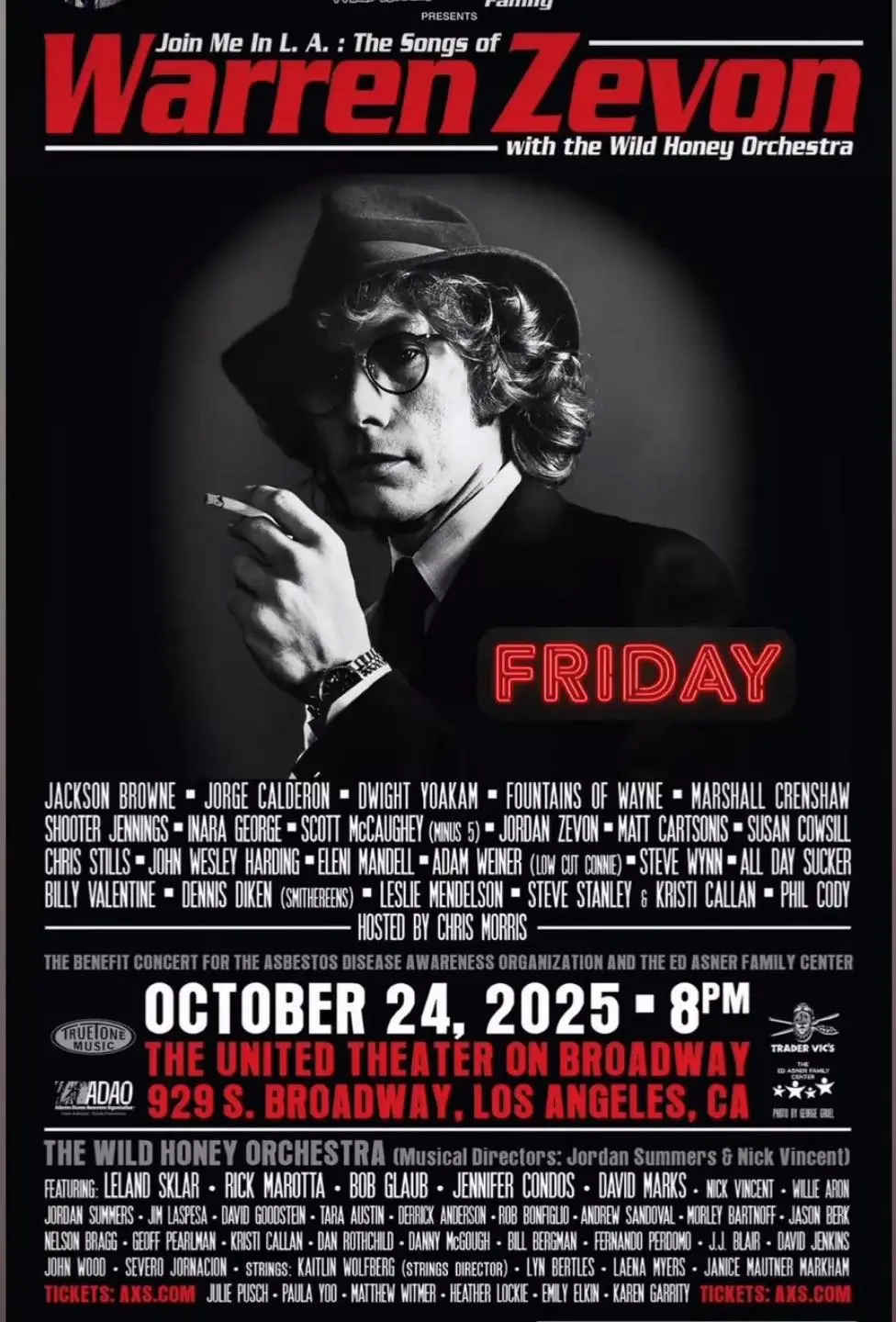 Last night the Warren Zevon tribute concert went down in Los Angeles at the United Theatre. The evening featured Jackson Browne, Fountains Of Wayne, Marshall Crenshaw, and more covering the legendary singer-songwriter with the Wild Honey Orchestra.